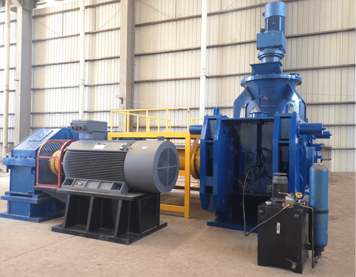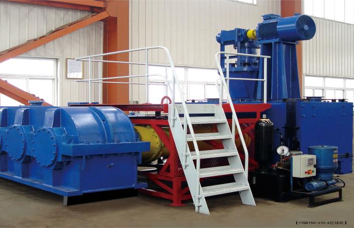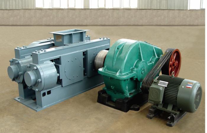 壓制難以成型的粉狀物料,其特點是成型壓力大、主機(jī)轉(zhuǎn)數(shù)可調(diào)、配有螺旋送料裝置。經(jīng)皮帶,傳至減速器,減速器通過聯(lián)軸器,傳至主動軸再由一對開式齒輪,保證兩滾軸同步(等速反向)物料儲料倉經(jīng)定量設(shè)備均勻地進(jìn)入成型料斗,使物料的單位成型壓力由小變大,在對輥中心連線處成型壓力達(dá)到最大值,物料過該線后,成型壓力迅速變小使物料進(jìn)入脫球狀態(tài),順利脫球。